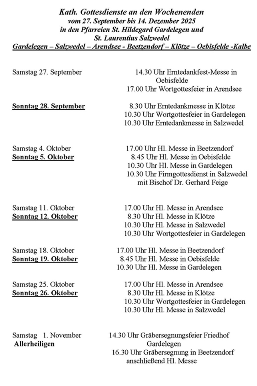 Vermeldungen für kath. Pfarreien St. Hildegard und St. Laurentius Gardelegen – Salzwedel – Arendsee - Beetzendorf – Klötze – Oebisfelde -Kalbe