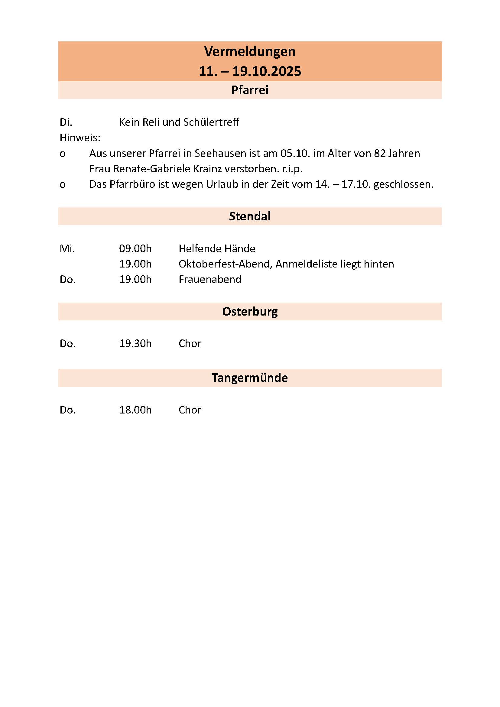 Wochentag | Datum | Stendal | Osterburg | Tangermünde | Sandau | Seehausen | Steckelsdorf |